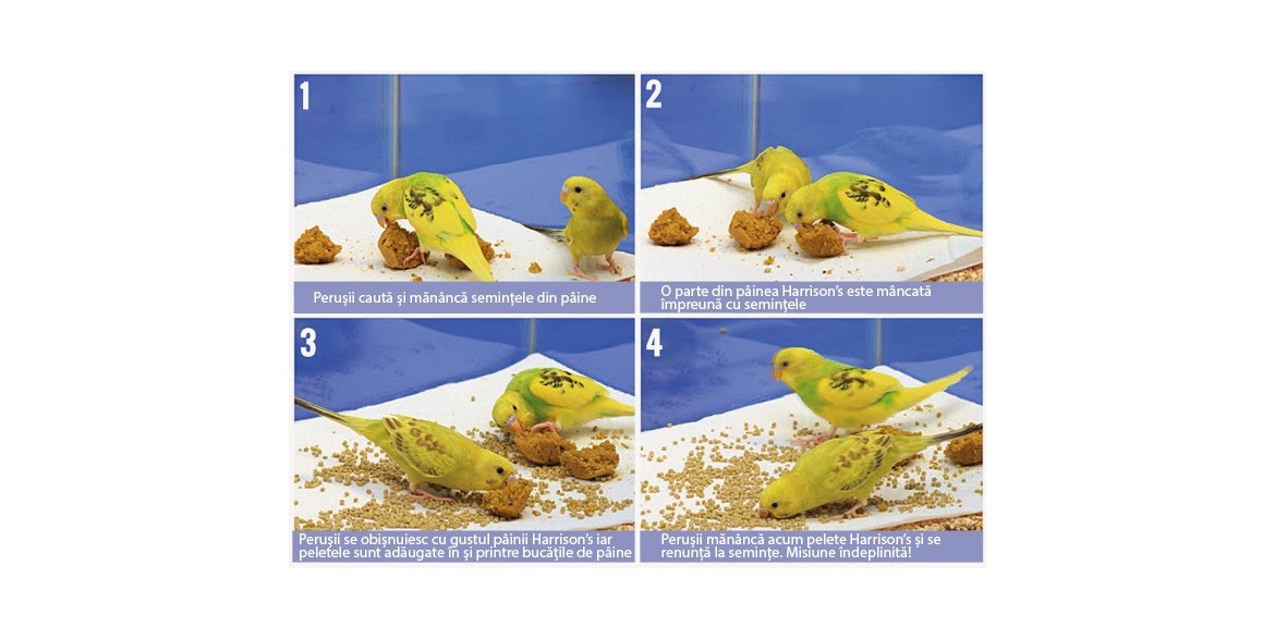 Vă recomandăm să faceți mici brioșe din premixul pentru păsari Harrison's Bird Bread Mix in care să puneți amestecul de semintele pe care pasărea le mănâncă (pentru a evita coacerea semințelor, acestea se pot introduce în pâine după coacere ). Apoi îi vom oferi păsării această pâine specială. Pâinea poate fi coaptă in diferite forme: brioșe, mini brioșe, chifle sau chiar în formă de pâine care va fi apoi tăită bucăți (Păinea se poate porționa și păstra la congelator, apoi puteți decongela porția zilnică). După ce pasărea s-a obișnuit sa ciugule din pâinea cu semințe, cantitatea de semințe se va reduce și va fi înlocuită cu peletele High Potency Super Fine (peruși, canari) sau High Potency Fine (agapornis, nimfe, etc.) . Dupa căteva zile semințele se vor inlocui complet cu pelete. Apoi printre bucățile de pâine cu pelete se pot pune și pelete separat. Treptat se poate scoate din dietă pâinea si vor rămâne doar peletele.