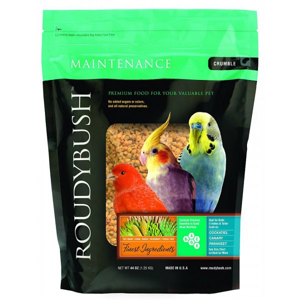 Roudybush Maintenance este un aliment complet echilibrat, potrivit pentru toate păsările granivore (ce se hranănesc cu cereale). Forma peletizată a furajului are avantajul că se poate evita hrănirea selectivă astfel încât pasărea ia, în acest fel, toate componentele alimentare nutritive într-o manieră echilibrată. Datorită procesului de fabricație complex și prin selectarea atentă a ingredientelor, mâncarea este foarte gustoasă și poate să fie adaptată la nevoile individuale ale tuturor păsărilor exotice, prin diferitele sale forme (nibles, crumble, mini, small, medium).