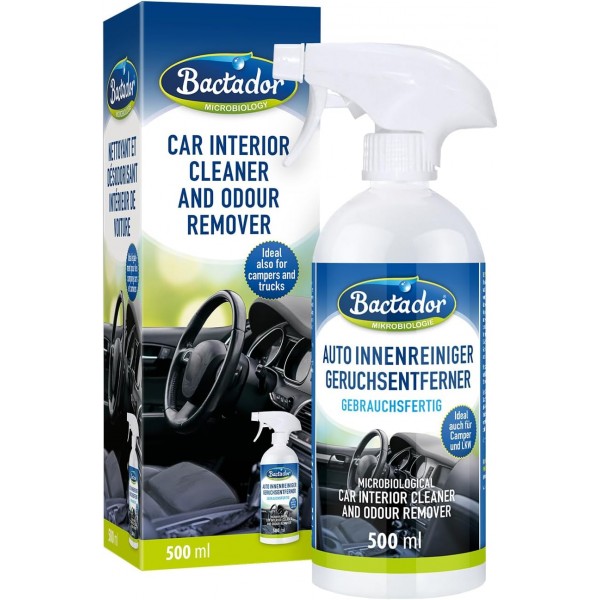 Curățare intensă: Pentru a elimina în mod corect și durabil mirosurile și petele, este necesar să nu le mascăm, ci să le eliminăm activ la sursă. Bactador Spray pentru interior auto este ideal pentru utilizare eficientă în întregul interior al automobilelor, camperelor sau camioanelor — de la mirosuri cauzate de alimente, băuturi, vărsături, nicotină până la cele produse de animale de companie.